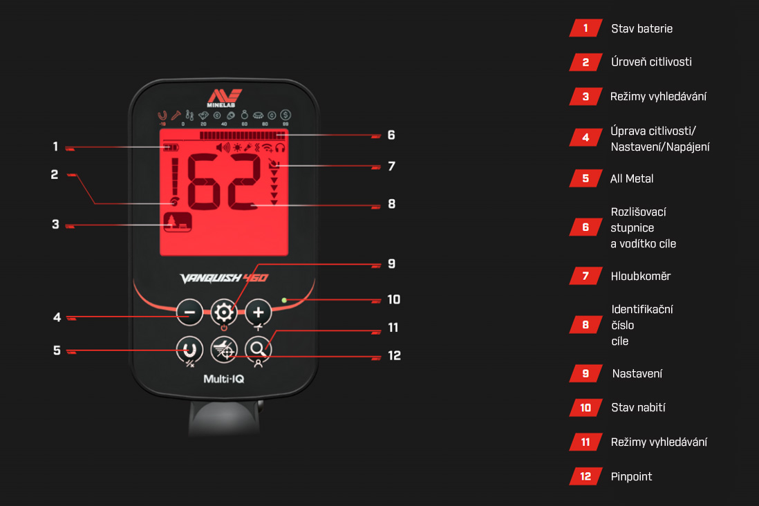 Minelab Vanquish 460 je lehký a plně automatický detektor kovů s technologií Multi-IQ, který nabízí vyšší výkon než běžné začátečnické modely. Je plně vodotěsný do 5 metrů, vybaven přesnou cívkou V10X, vibrací v rukojeti a podporou Bluetooth LE Audio, takže umožňuje pohodlné a efektivní hledání v jakémkoli terénu.
